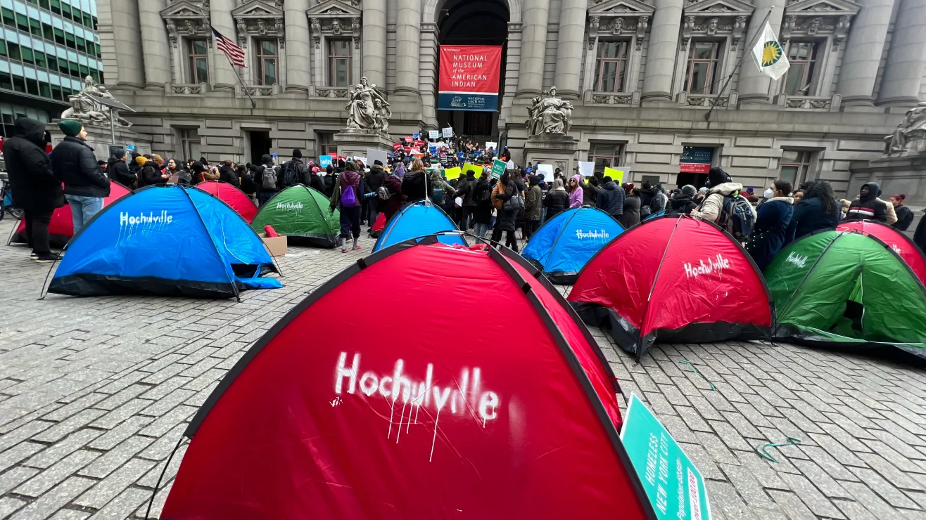 Con más de 100,000 personas en albergues y hoteles de emergencia, mayormente solicitantes de asilo, en pleno frío, manifestantes instalaron carpas en Wall Street para exigir al Alcalde Adams que cese su lucha para acabar con la obligación municipal de suministrar techo y a la Gobernadora que impulse programas de inversión de vivienda permanente.