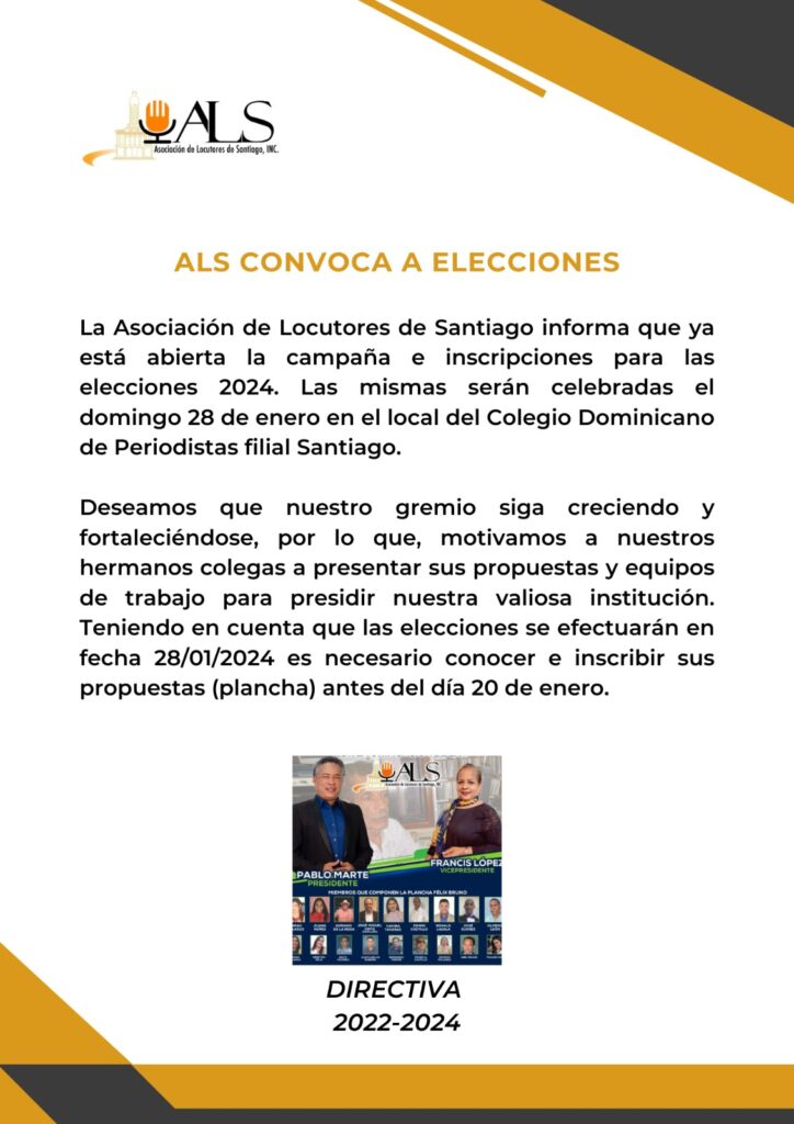 “ La Asociación de Locutores de Santiago informa que ya esta abierta la campaña e inscripciones para las elecciones 2024”, se lee en la primera parte del comunicado de gremio.