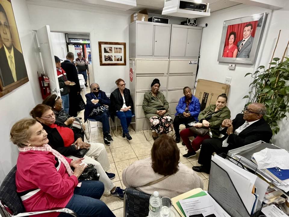 PIE DE FOTO. NUEVA YORK. El consultor de salud Jaime Vargas celebra el 45 aniversario de la apertura de su agencia en el Alto Manhattan junto a numerosos envejecientes a los que ayuda con la cobertura de los seguros Medicaid y Medicare. (Fotos José Zabala).