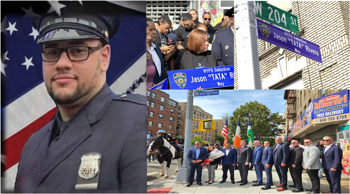 Docenas de comunitarios, el comisionado del NYPD, Edward Caban, el congresista Adriano Espaillat, concejales, senadores y asambleístas estatales estuvieron en el acto donde se develizó el rótulo que lleva el nombre de “Detective Jason Rivera (Tata) Way” para que las actuales y futuras generaciones conozcan el servicio, sacrificio e inmolación del oficial que fue ascendido póstumamente a detective por el NYPD después de su muerte.