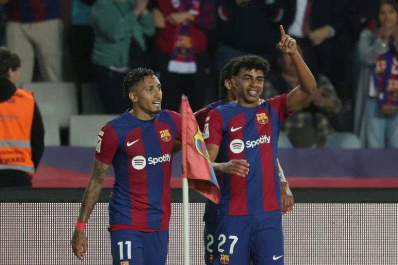 Ante algo menos de 36.000 espectadores en el estadio Olímpico Lluis Companys, el extremo español Lamine Yamal, de 16 años, abrió el marcador en el minuto 40 al término de un buen movimiento colectivo con Robert Lewandowski e Ilkay Gündogan, antes de que el brasileño Raphinha doblase la ventaja tras penal señalado por el VAR en el tiempo añadido (90+3).