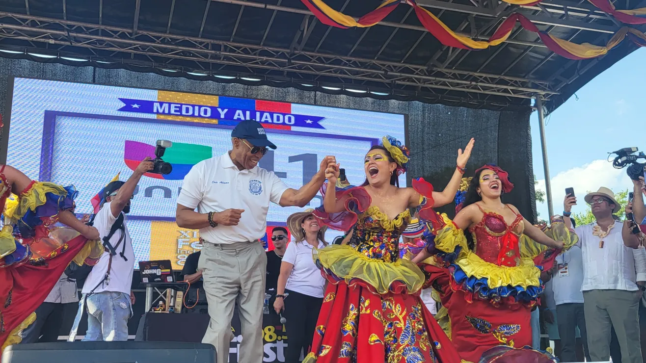 El alcalde de la Ciudad de Nueva York, Eric Adams, pasó a saludar a las miles de personas que la tarde de ayer se reunieron en el Hall de la Ciencia del parque de Flushing Park este domingo. En algún momento, invitado por las bailarinas que ya estaban en la tarima listas para ejecutar su número, Adams, debió ensayar algunos pasos ante la algarabía de los cientos que pudieron comprobar que el alcalde se defiende bien, al menos en los pasos de cumbia básicos.
