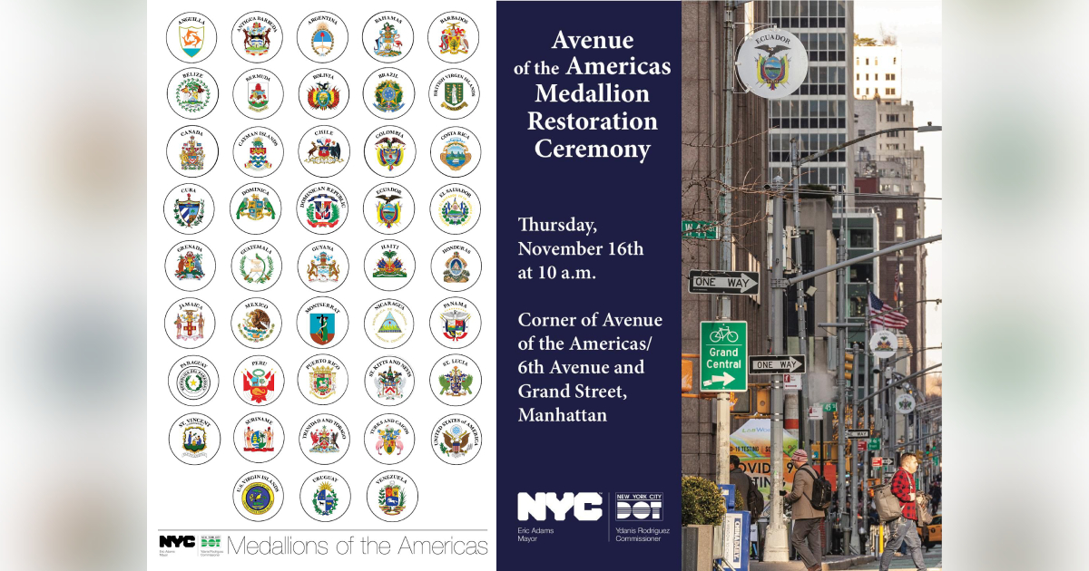 Nueva York —El comisionado del Departamento de Transporte de la Ciudad de Nueva York, Ydanis Rodríguez, el comisionado de la Oficina del Alcalde para Asuntos Internacionales, Edward Mermelstein , y el comisionado de la Oficina del Alcalde para Asuntos de Inmigrantes, Manuel Castro, anunciaron hoy la restauración total y el reemplazo de los medallones nacionales a lo largo de la Avenida de las Américas. Los medallones, que representan los emblemas de 43 naciones y territorios del hemisferio occidental, ahora adornan la Sexta Avenida entre las calles Canal y 59 th . Cada entidad es reconocida con cuatro medallones a lo largo del corredor. Instalado originalmente en 1959, a principios de año solo quedaban 18 de los medallones originales a lo largo del corredor. NYC DOT completó las instalaciones el mes pasado y el evento de hoy se llevó a cabo en el corredor directamente al norte de Canal Street en la Plaza Juan Pablo Duarte, que rinde homenaje al principal padre fundador de la República Dominicana.