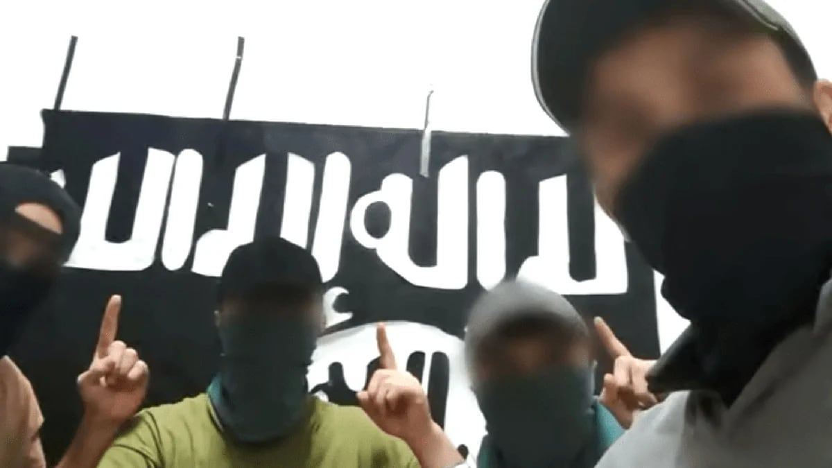 La imagen fue difundida por la agencia Amaq, el principal canal propagandístico de la organización, y en ella aparecen cuatro personas con media cara tapada, gorra y los ojos pixelados delante de una gran bandera del Estado Islámico.
