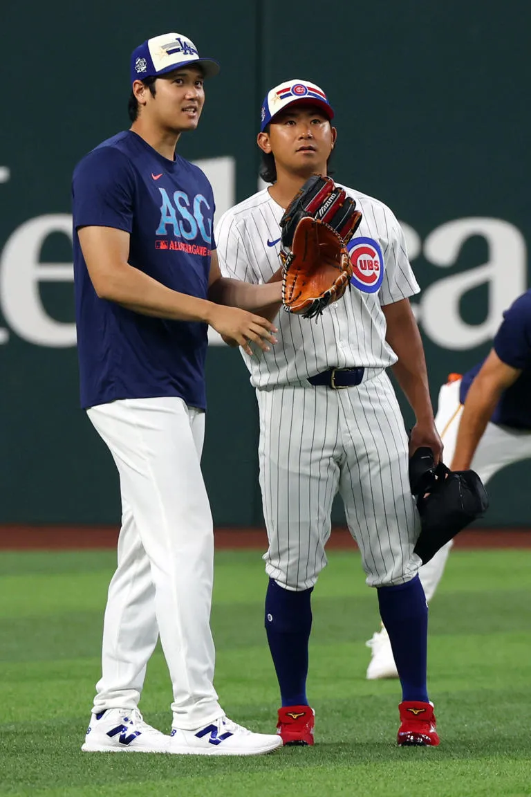 ARLINGTON, TEXAS – JULY 15: Shohei Ohtani #17 of the Los Angeles Dodgers speaks with Shota Imanaga #18 of the Chicago Cubs during Gatorade All-Star Workout Day at Globe Life Field on July 15, 2024 in Arlington, Texas. Richard Rodriguez/Getty Images/AFP (Photo by Richard Rodriguez / GETTY IMAGES NORTH AMERICA / Getty Images via AFP)© RICHARD RODRIGUEZ (AFP)