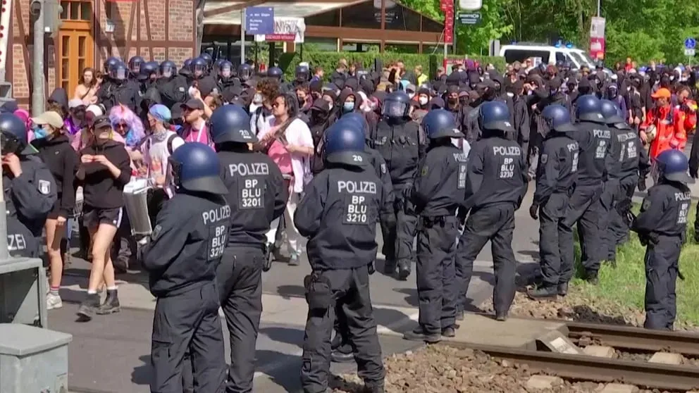 La policía trata de contener una manifestaciónen la fábrica de Tesla en Alemania