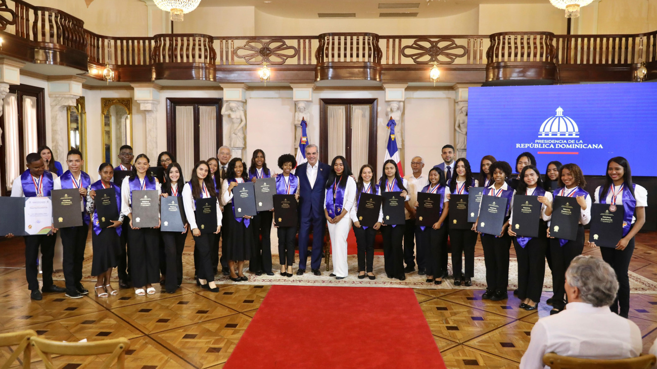 Santo Domingo.- El presidente Luis Abinader junto con el ministro de Educación, Ángel Hernández, entregó este miércoles el «Galardón Diploma de Máxima Excelencia 2023-2024” a 150 estudiantes de las 18 direcciones regionales de educación del país, que obtuvieron un promedio académico superior a 90 puntos, durante su trayectoria de seis años en la secundaria.